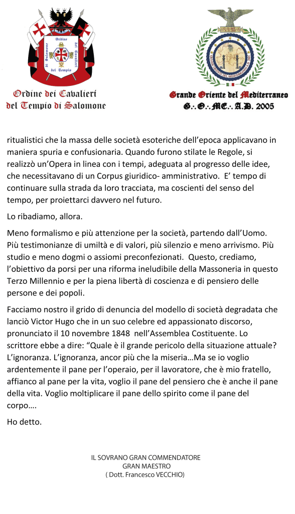 Meno formalismo, allora, e più attenzione per la società, partendo dall’Uomo. Più testimonianze di umiltà e di valori, più silenzio e meno arrivismo. Questa la nostra proposta per una riforma ineludibile della Massoneria in questo Terzo Millennio.