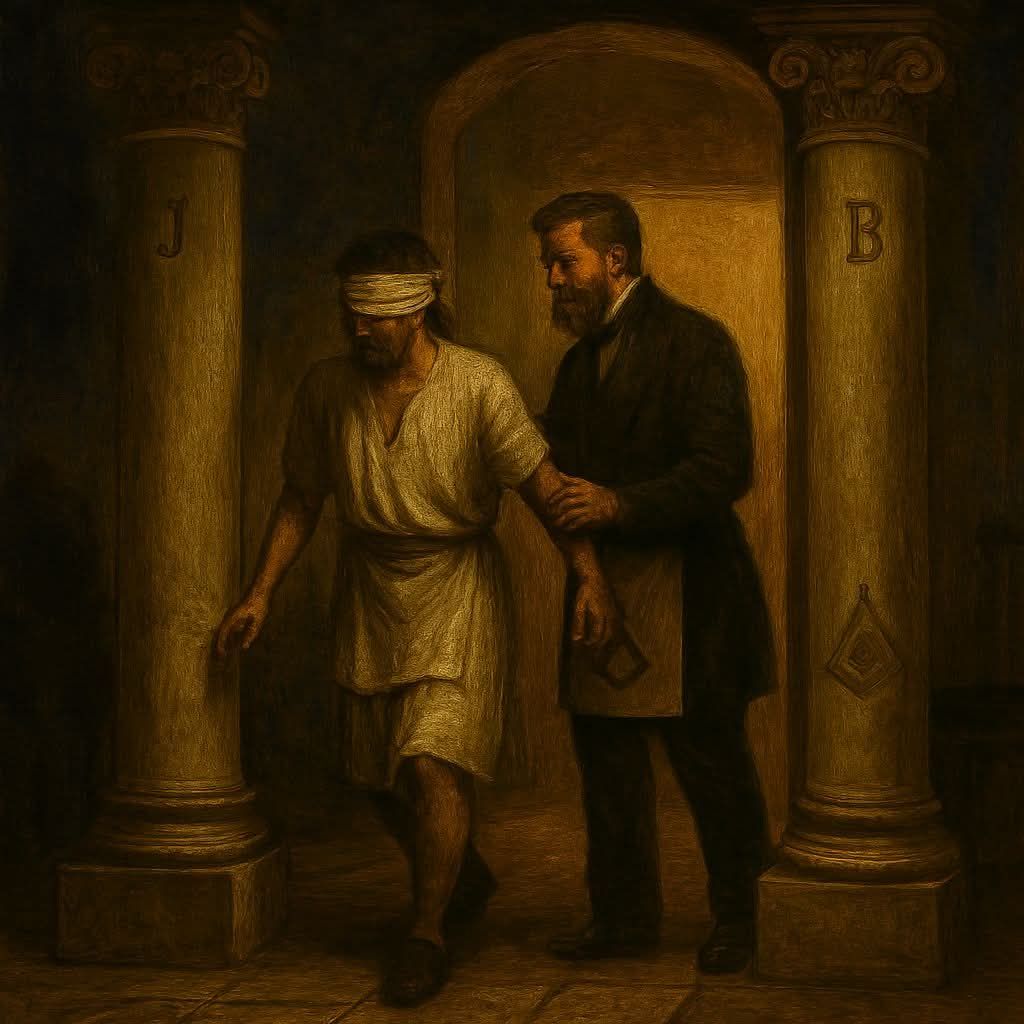 La soglia rappresenta non solo un confine fisico, ma anche un portale esoterico. Varcare questa porta significa abbandonare il panorama drammatico e tumultuoso della vita di tutti i giorni per entrare in uno spazio protetto, dedicato alla ricerca del sapere. Tradizionalmente, l’iniziato non attraversa mai la soglia da solo; viene bendato e guidato da un altro membro della loggia. Questo gesto non è casuale, ma carico di simbolismo: l’oscurità della benda simboleggia l’ignoranza, mentre il guidare rappresenta la necessità di fiducia e condivisione della conoscenza.