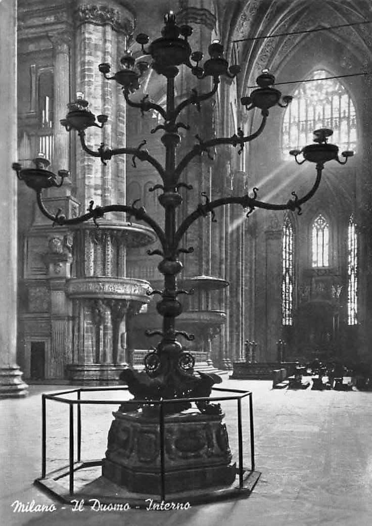 È il Candelabro Trivulzio, alto cinque metri, largo quattro, imponente nella sua massa bronzea, mappure circondato da un silenzio d’oblio.